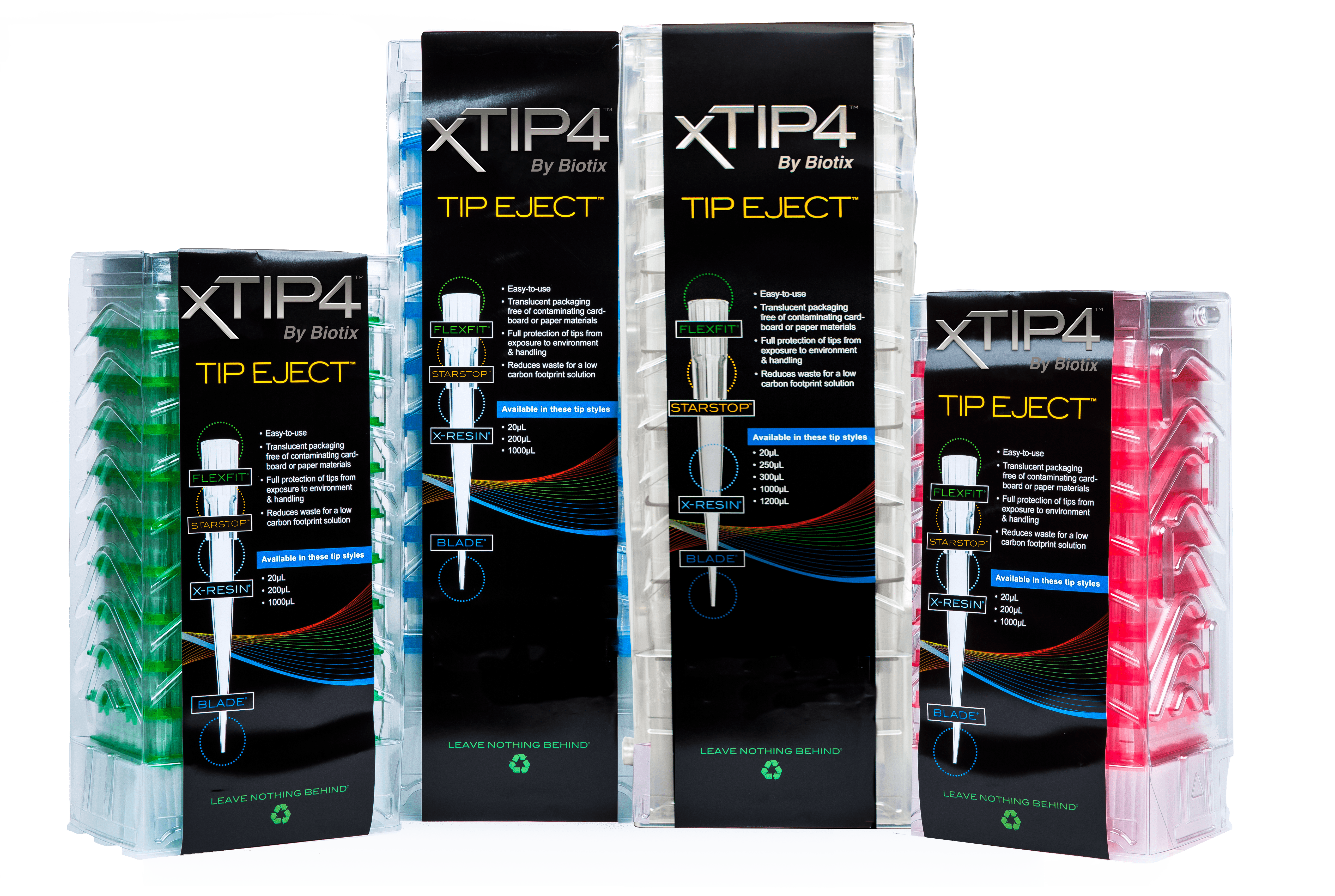 Pipette tip racks are fully autoclaveable at 121° C after transfer from reload. Tip Eject reloads are compatible with Biotix xPIPETTE and Rainin LTS pipette.